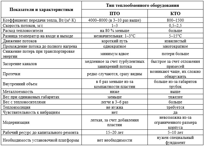 Наибольшим спросом пользуются пластинчатые и кожухотрубные теплообменники. Их сравнительные характеристики даны в таблице: